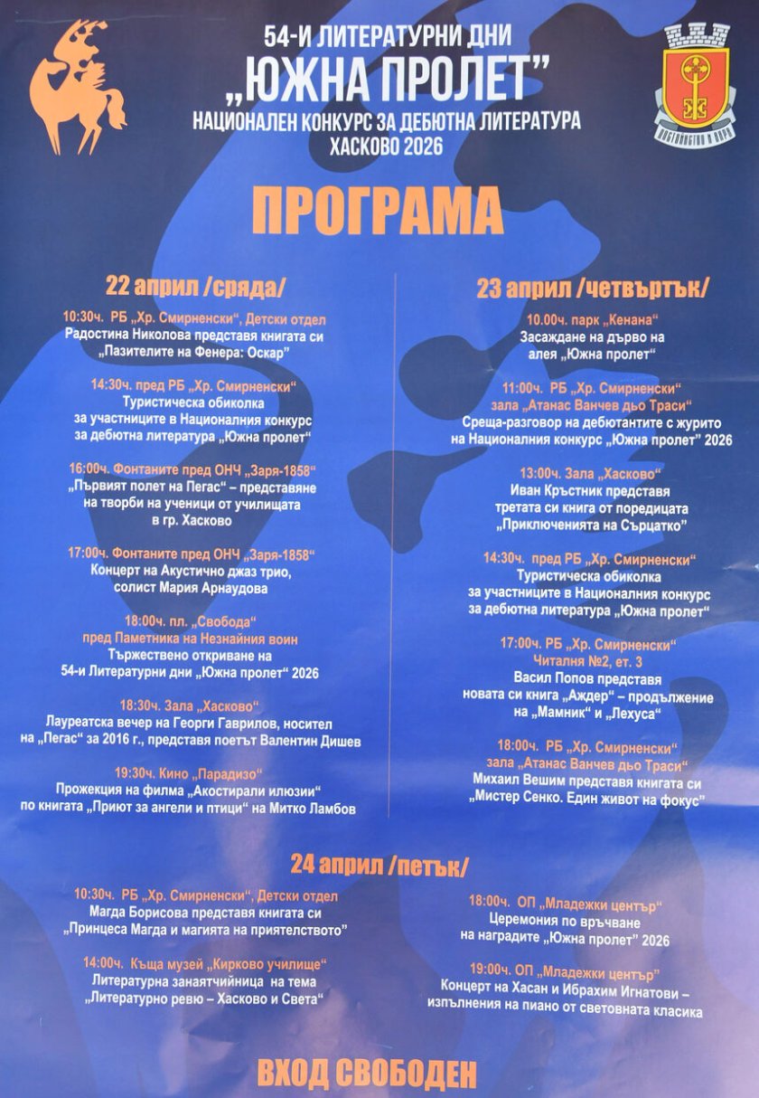 Хасково отново влиза в ролята на литературна сцена. Между 22 и 24 април градът ще бъде домакин на 54-ите Литературни дни „Южна пролет“. Фокусът остава ясен. Това е националният конкурс за дебютна литература. Той се приема като ключов вход за нови автори в българската култура.