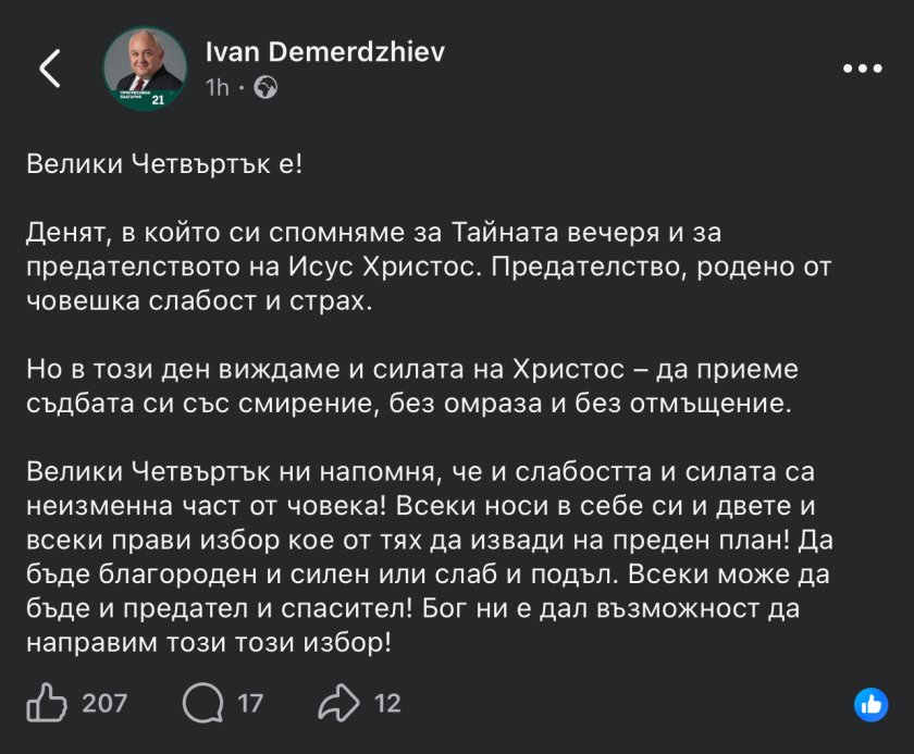Иван Демерджиев публикува послание по повод Велики Четвъртък, в което акцентира върху символиката на деня и значението на личния избор между слабостта и силата.