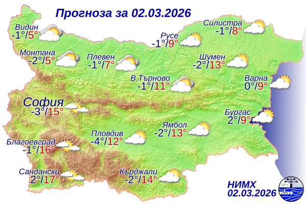 След обяд видимостта ще се подобрява. Ще духа слаб, предимно северен вятър. Максималните температури ще бъдат между 12° и 17°, а в районите с по-трайна мъгла – между 5° и 10°. В София се очакват около 15°.