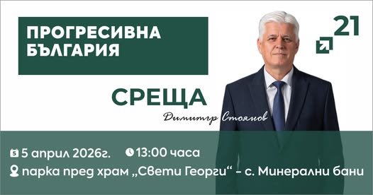 Утре, 5 април 2026 г. (неделя), в 13:00 часа, в центъра на село Минерални бани (Хасковска област) ще се проведе открита обществена среща на коалиция „Прогресивна България“. Събитието ще се състои в парка пред храм „Свети Георги“ и е с водещо участие на инж. полк. Димитър Стоянов – водач на листата на коалицията за 29-и МИР – Хасково (номер 21 в бюлетината).